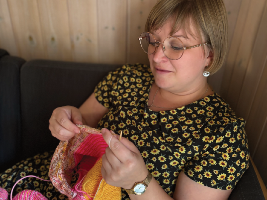 Pernille er på billedet selv i gang med Vertical Unite fra bogen Sjaler – Westknits Bestknits af Stephen West. Garnet er bare nogle rester fra Pernilles overskudsgarn.