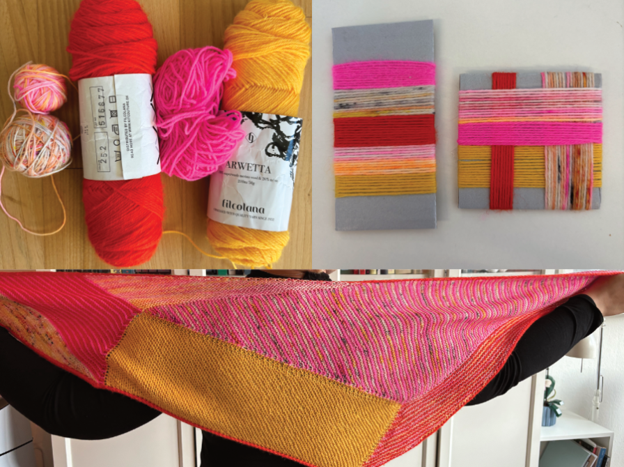 For mig var de håndfarvede vigtigst, så jeg byttede lidt rundt på farverne i sjalet så de fik nogle større blokke. Jeg løb også tør for den ene, men så betød det bare, at jeg sluttede projektet lidt før tid.