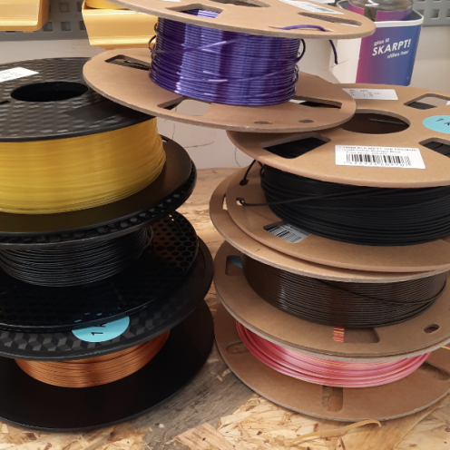 Som et offentligt og åbent makerspace arbejder vi kun med filamenttyper, der er sikre at bruge uden specialudsugning. Derfor tilbyder vi kun PLA og PETG.
